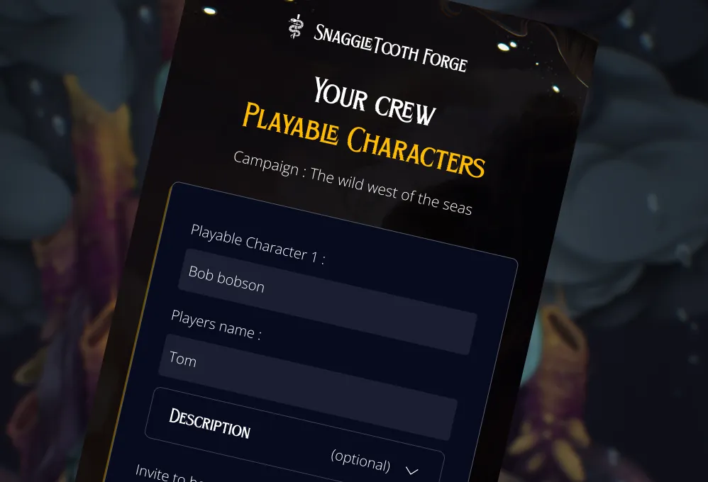 Hey, I'm Tom. I built Snaggletooth as a solo project to help me remember everything going on in the worlds I create with my friends, and to support the incredible artists out there. I hope you like it, I'm always open to feedback and new ideas so keep an eye on how it evolves...